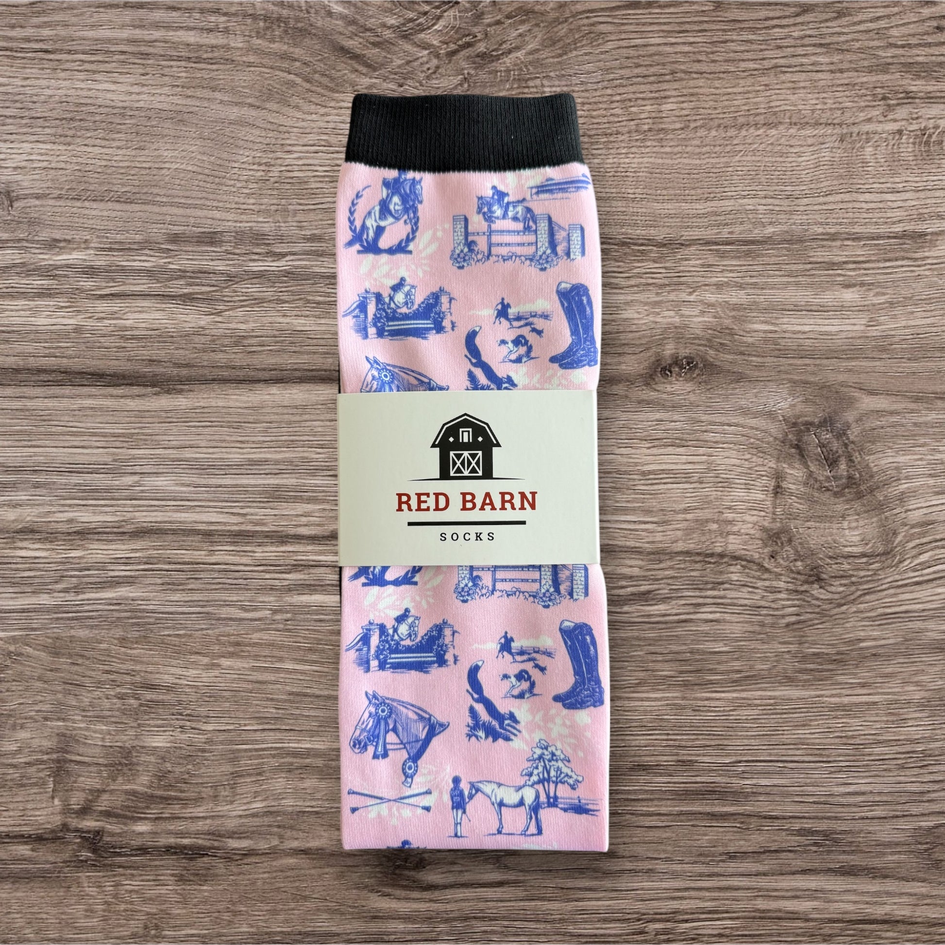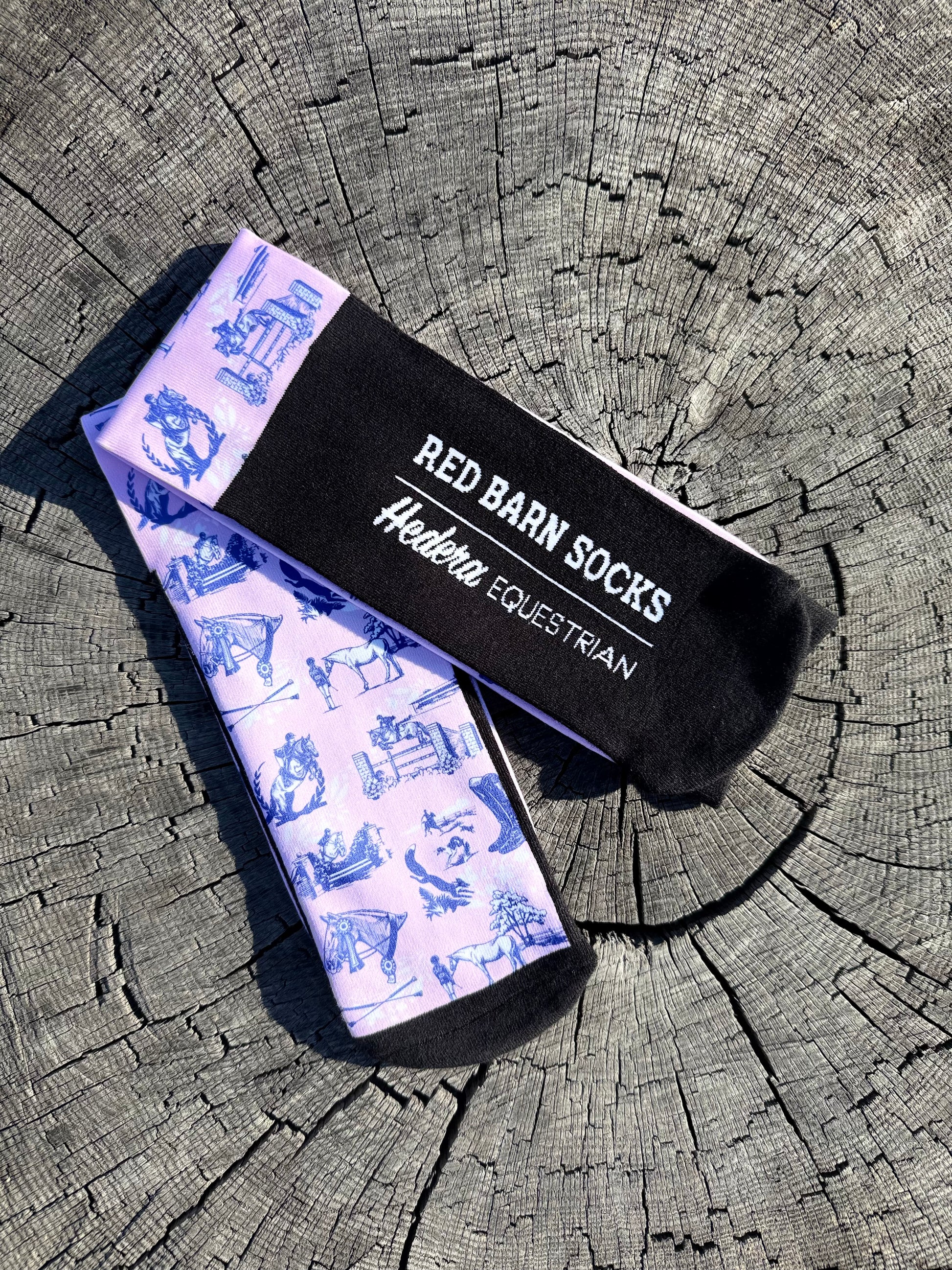 Classic meets modern in this exclusive collaboration between Hedera Equestrian and Red Barn Socks. These pink and blue boot socks feature a timeless toile-inspired design with equestrian scenes, perfect for riders who love a touch of elegance in the barn or the saddle. Wear them in your paddock or tall boots and elevate your riding wardrobe and comfort.