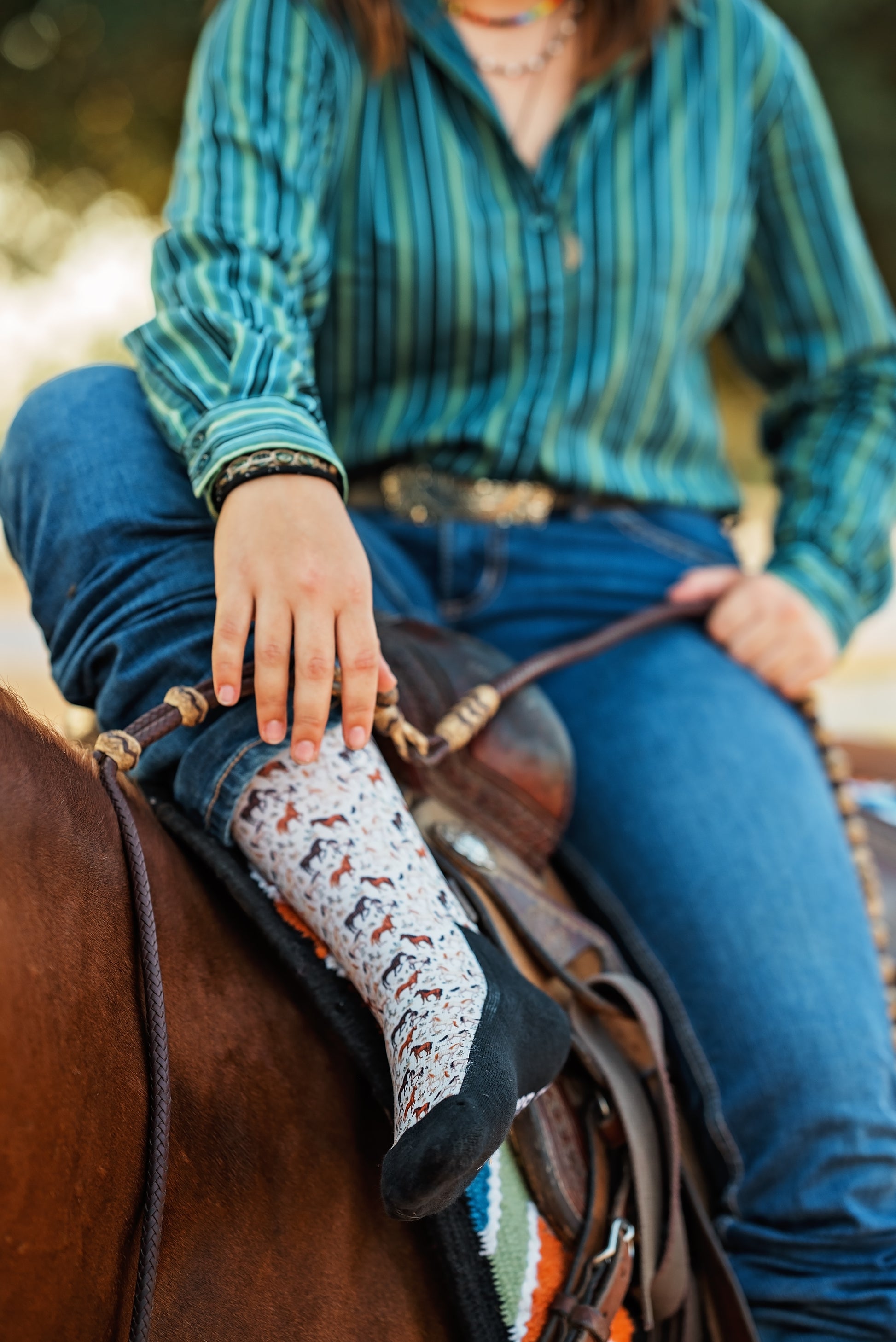 Let your love for horses run free with our Pasture Pals socks, available in petite size! Covered in a herd of beautifully illustrated horses in warm, earthy tones, these socks bring the charm of the pasture to your everyday look. The petite size is 2-3" shorter in length, but still fits an average foot, perfect for youth, smaller calves, or anyone who prefers a shorter sock without sacrificing comfort.