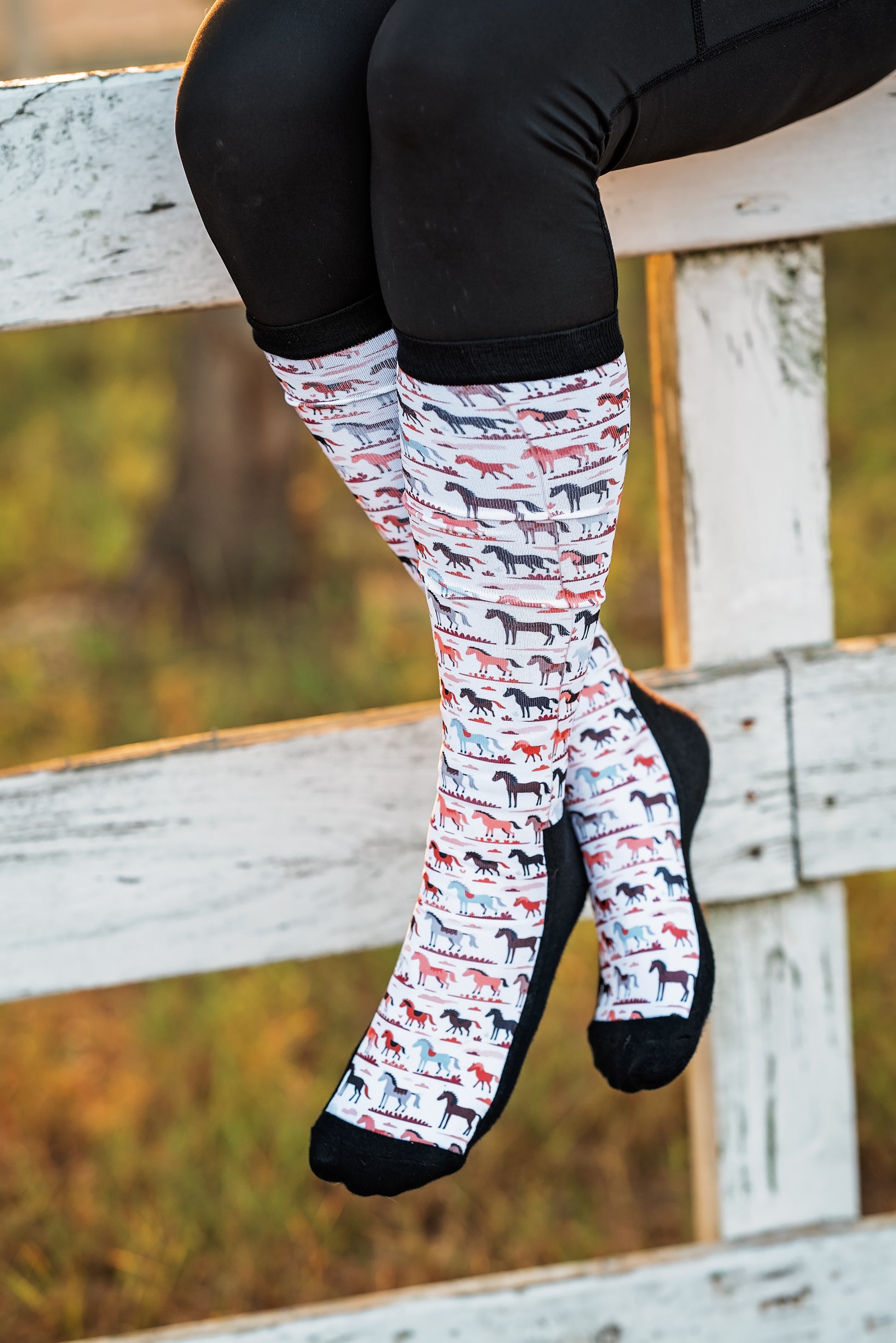March into style with our Pasture Parade socks, featuring rows of colorful horses showing off their personalities across a soft white background. This fun design celebrates the beauty of the herd and brings a pop of equestrian charm to your wardrobe. Bring the whole herd along wherever you go!
